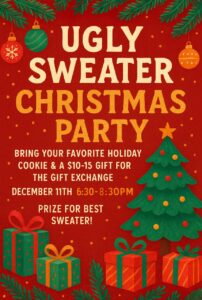 Please wear your ugliest sweater, and bring your favorite cookies for everyone to share!