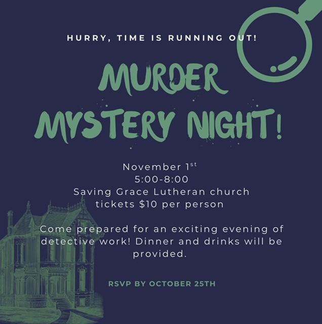 Clue themed murder mystery! Please RSVP (HERE) as soon as you can so that we can assign you your character! This event is open to middle school and high school students. You are welcome to invite friends to this event if you would like. Please send their contact to us so they can join in on the fun. (Dressing for your role is encouraged, but not required.)