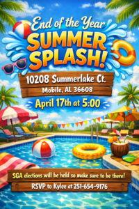 Running for SGA: If you are interested in running for a position, or have any questions, please contact Kylee Woodward at 251-654-9176 by April 10th and specify which position you would like to run for. Come to this event prepared to give a brief speech about why you would be a good match for the position in which you are running.
